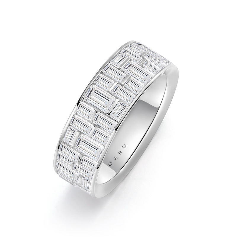 The ORRO Augustus Band Ring radiates quiet strength and sophistication with its bold design. Featuring a structured mosaic of emerald-cut stones in three graduated sizes, the ring’s surface shimmers with architectural precision and contemporary flair. This wide band makes a striking impression while remaining timeless and wearable.