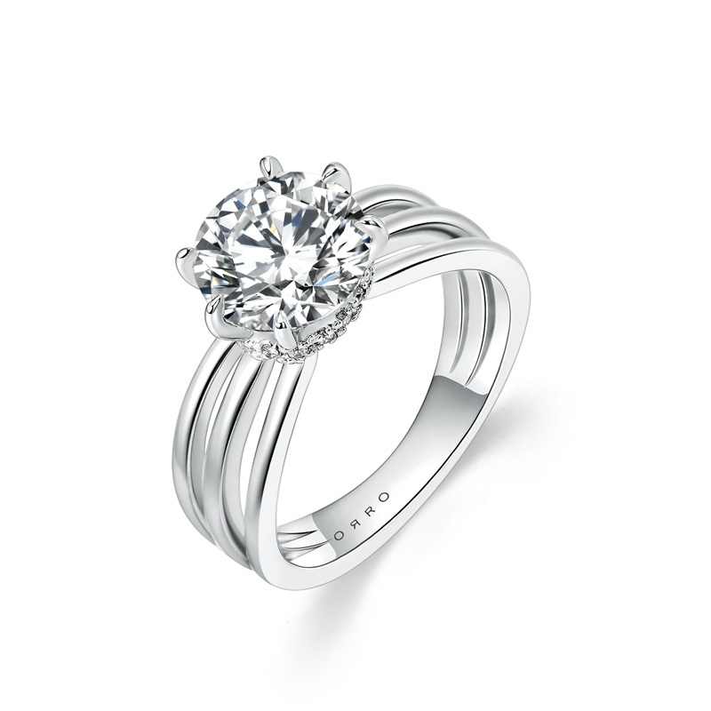 Bold and sculptural, the ORRO Bellona Ring exudes a commanding presence with a refined sense of grace. A brilliant 2.00ct round-cut center stone is held aloft in an elegant six-prong setting, encircled beneath by a discreet halo of micropavé diamonds that adds a hint of brilliance when viewed from the side. The most striking feature lies in its distinctive triple-band shank — three gleaming rows of polished metal that flow seamlessly into a single band, offering a modern architectural silhouette that’s both dramatic and refined.