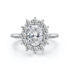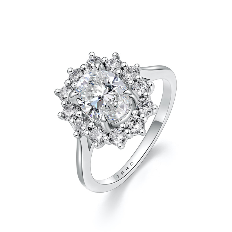 The ORRO Darcey Ring showcases a stunning brilliant cut oval center stone, elegantly surrounded by a halo of round brilliant gems. This halo enhances the center stone's brilliance, giving the ring a more expansive diamond surface that radiates beauty from every angle. Complementing this impressive centerpiece is a timeless, classic plain band, allowing the dazzling diamonds to take center stage without distraction.