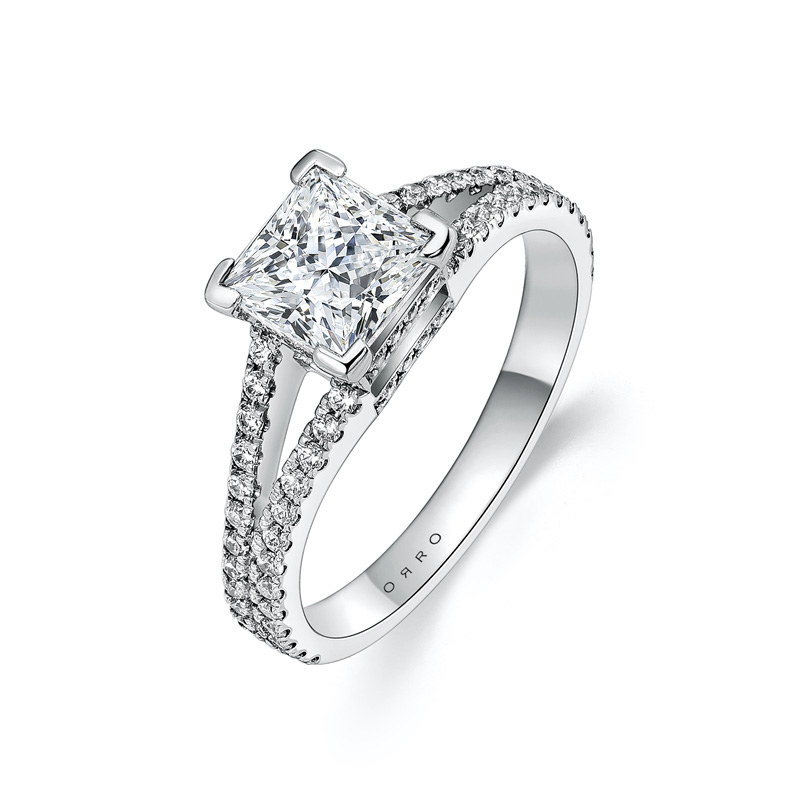 A bold celebration of symmetry and brilliance, the ORRO Emeri Ring features a dazzling 1.25ct Princess-cut center stone secured by four claw prongs, exuding modern sophistication and architectural elegance. The brilliance is amplified by a split shank band paved with over 70 round brilliant melee stones, gracefully tapering to highlight the central gem. From the side view, twin diamond-set bridges beneath the center stone add an element of surprise and craftsmanship, offering visual intrigue from every angle. Perfect for those who seek a refined yet striking design, the Emeri Ring is a timeless choice that commands admiration.