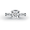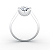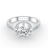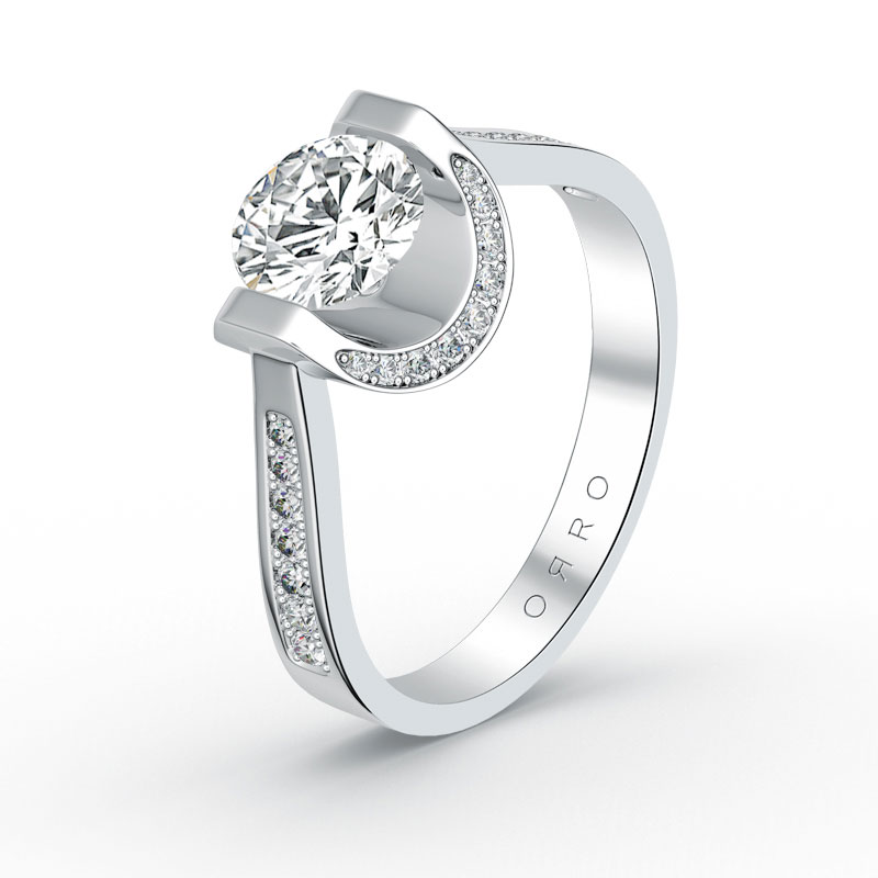 This unique ring features a singular sparkling 1.0ct round brilliant cut stone in a supported tension setting cupped by a semi-circular piece featuring a row of dazzling round brilliant side stones in a pave setting on either side. The adjoining bands also hold 7 sparkling round brilliant cut stones on each side, making the ring a sight to behold.