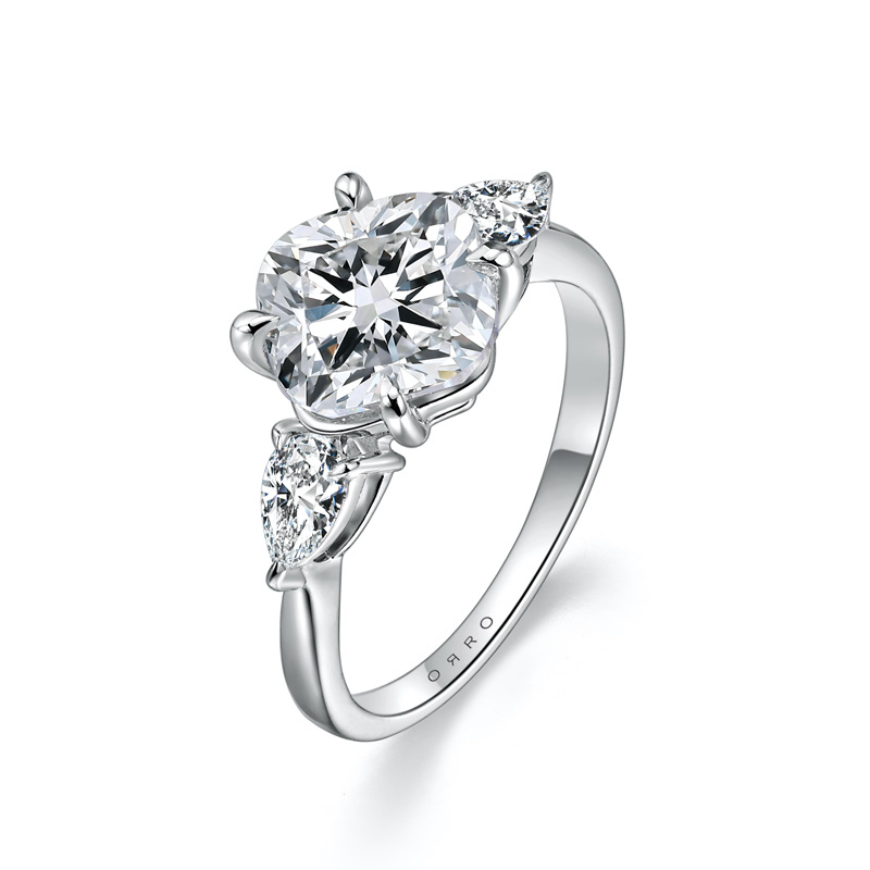 The ORRO Leona Ring is a stunning embodiment of elegance and sophistication in a trilogy design. At its heart lies a captivating square cushion cut diamond, artfully positioned with its pointed sides parallel to the band, creating a striking visual effect that enhances its unique charm.
