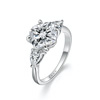 Flanking the center stone are two beautifully shaped pear diamonds, gracefully curving to complement the cushion cut’s distinct silhouette. The entire arrangement is secured by four eagle claw prongs, ensuring the center diamond is held with both style and strength.