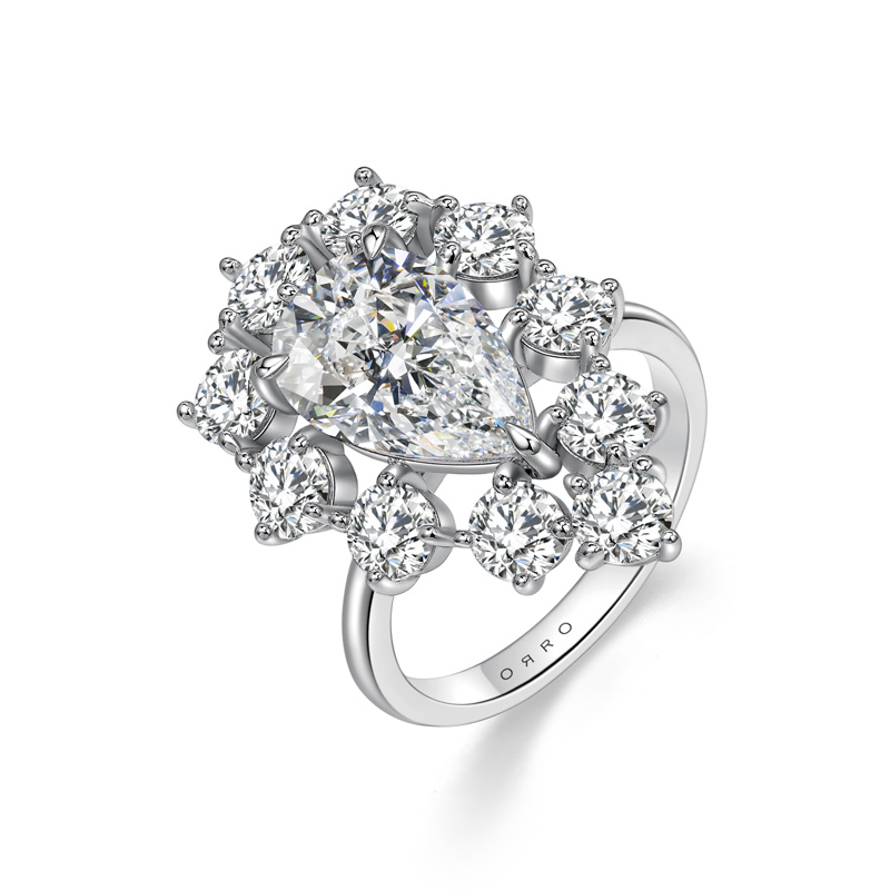 A true masterpiece of regal glamour, the ORRO Magnificent Micaela Ring is designed to command attention with every movement. At the heart of this exceptional creation lies a stunning pear-shaped center stone, radiating with brilliance and poise. Surrounding it, a majestic halo of round brilliant gems fans outward in a meticulously arranged pattern, creating a lavish silhouette reminiscent of a royal crest.