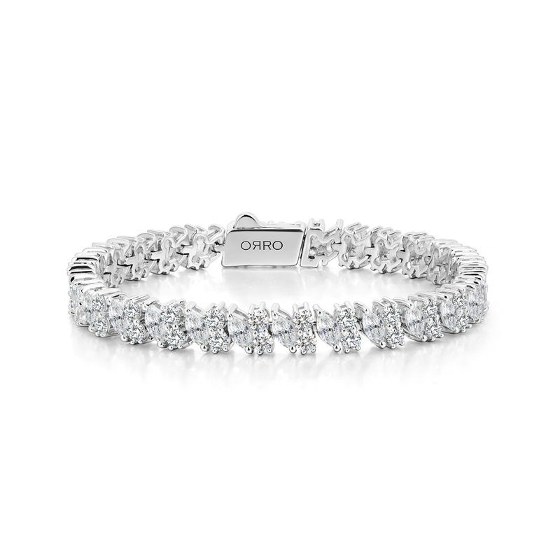 A contemporary twist on the classic tennis bracelet, the ORRO Selene Bracelet features alternating marquise and round brilliant stones set in a striking pattern that mimics soft, shimmering waves. Each marquise gem (2.5x5mm) is delicately framed by two round brilliant gems (2.5mm), creating a rhythmic flow of brilliance and fluidity. The Selene Bracelet is secured with the signature ORRO spring clasp — engineered for effortless wear while ensuring a secure, snug fit throughout the day. A refined statement piece with graceful geometry and radiance in every angle.