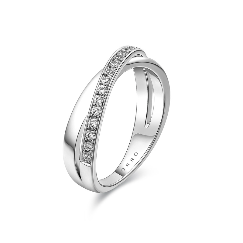 Elegantly intertwined, the ORRO Theresa Band Ring presents a sophisticated harmony of style and grace. Featuring a dynamic cross-over design, this exquisite band beautifully showcases a ribbon of meticulously pave-set round brilliant diamonds gracefully intersecting a polished metal band. With a contemporary silhouette that represents the eternal connection between two souls, the Theresa Band is a meaningful expression of unity and elegance, perfect as a standalone statement or a striking complement to other cherished rings.