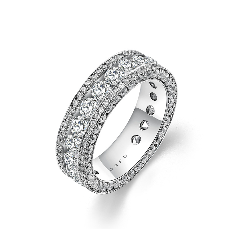 Bold and resplendent, the ORRO Violante Ring is a masterpiece of brilliance and symmetry. This full eternity design features a radiant row of round brilliant stones, securely set in the center band to create an unbroken stream of sparkle. Framing this dazzling row are two slender pavé-set lines of melee stones, adding depth and intricacy to the design. With over 200 hand-set stones in three precise sizes, this ring is a true celebration of craftsmanship and light. Whether worn as a statement wedding band or a glamorous right-hand ring, the ORRO Violante Ring is designed to turn heads from every angle.